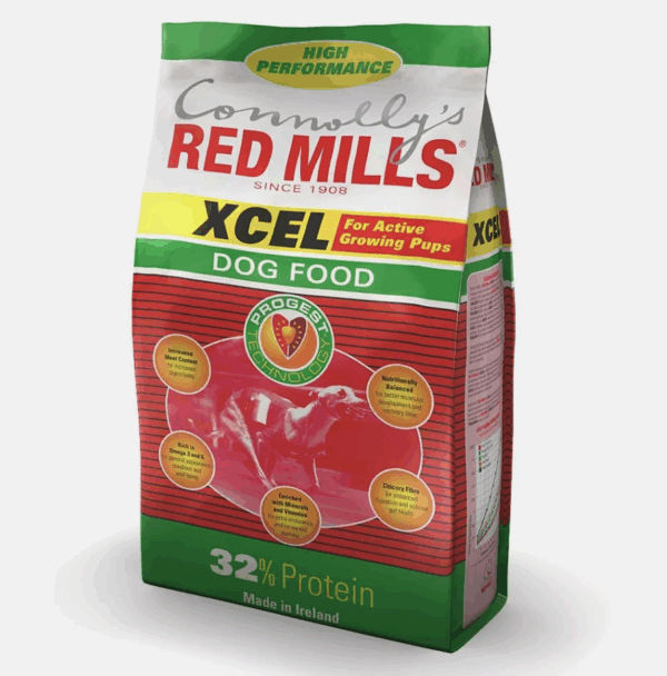 Connolly's RED MILLS Xcel 32 is a high performance feed designed to meet the needs of pups, brood bitches and racing dogs in sustained training.